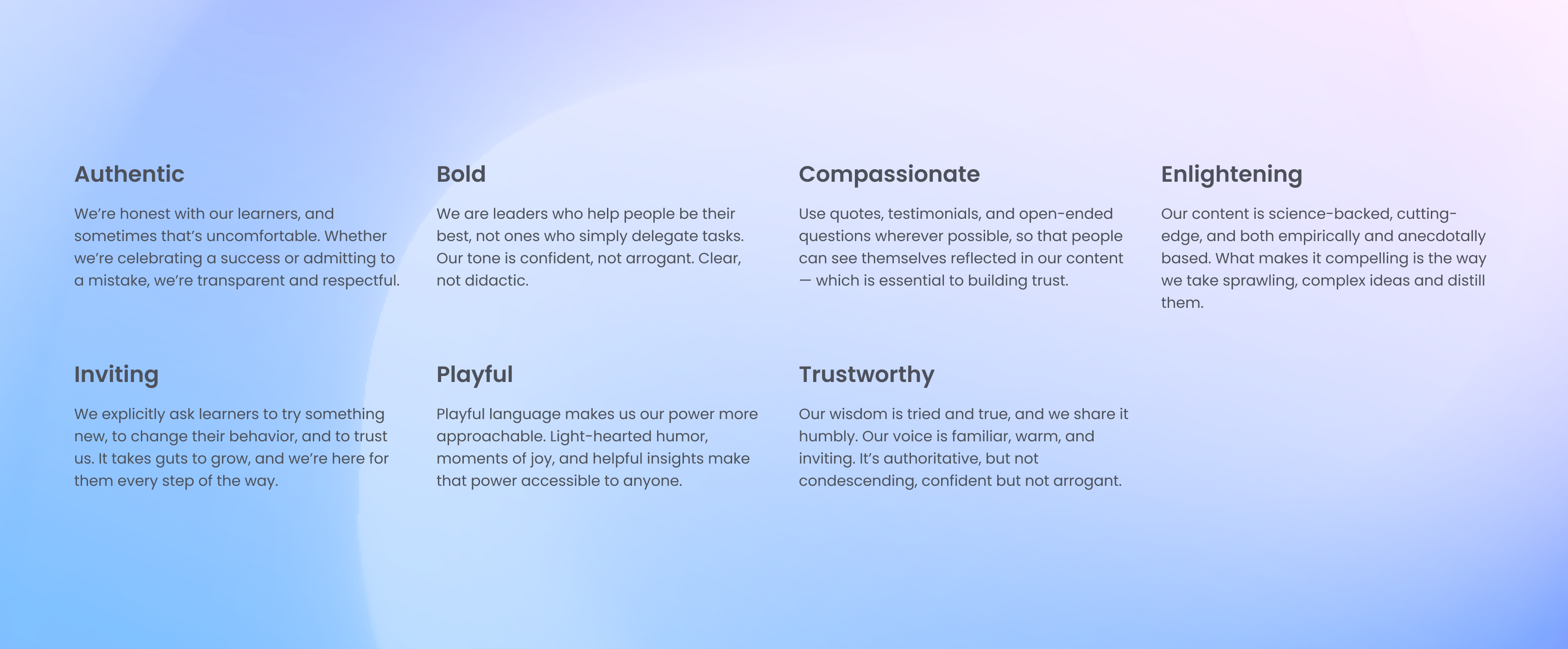 Before approaching anything visual, we identified ion’s key personality traits and articulated them clearly. This guide served as the north star for all visual and informational decisions. Balancing play and authority led us to a soft, pillowy, and slightly candy-like visual language — every e-learning module became a delectable little treat.