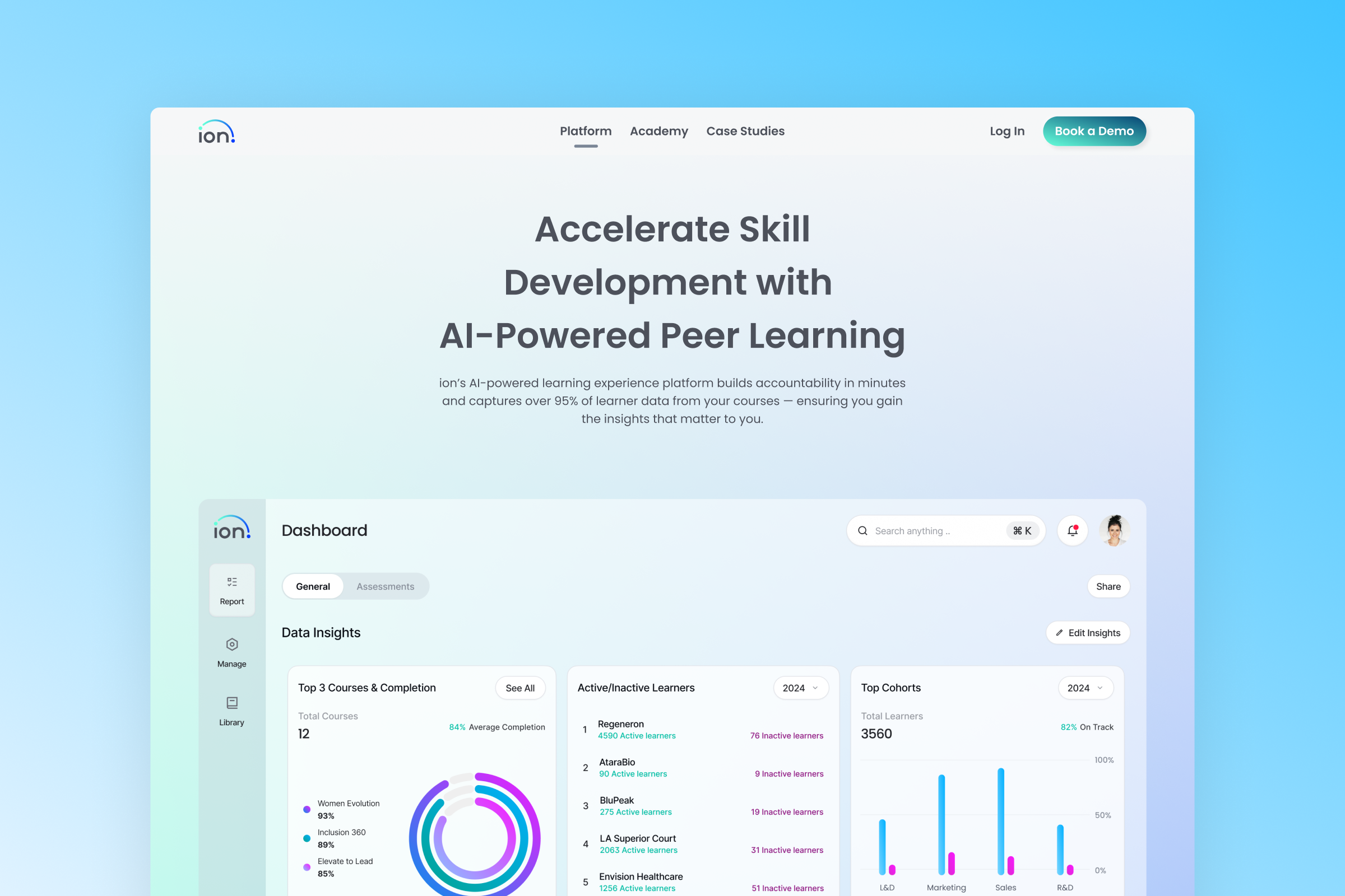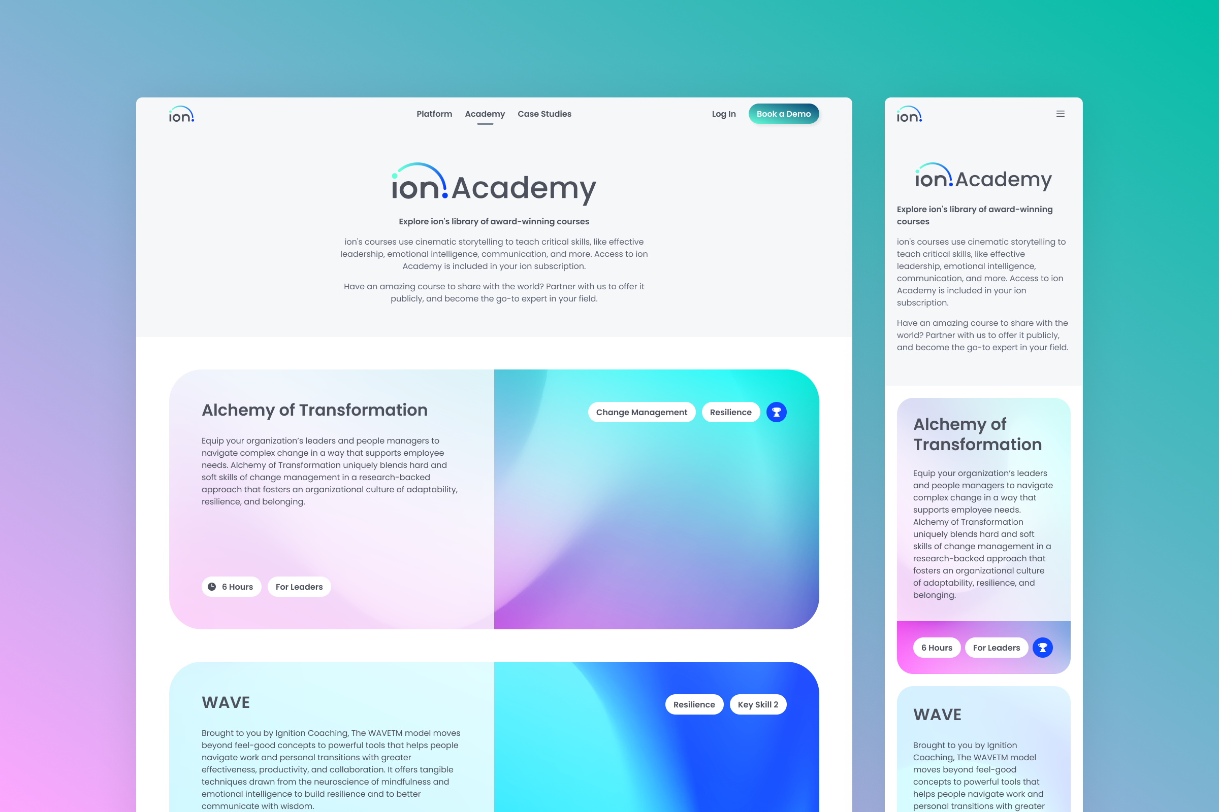 The ion website needed a radical transformation from afterthought to centerpiece. And although learners aren’t ion’s clientele, polishing their first impression when logging in was a missed opportunity. So we began a complete overhaul. By positioning ion’s course catalog as a distinct feature from its platform, we simplified the web experience — the platform and courses are intrinsically linked, but easier to understand separately.